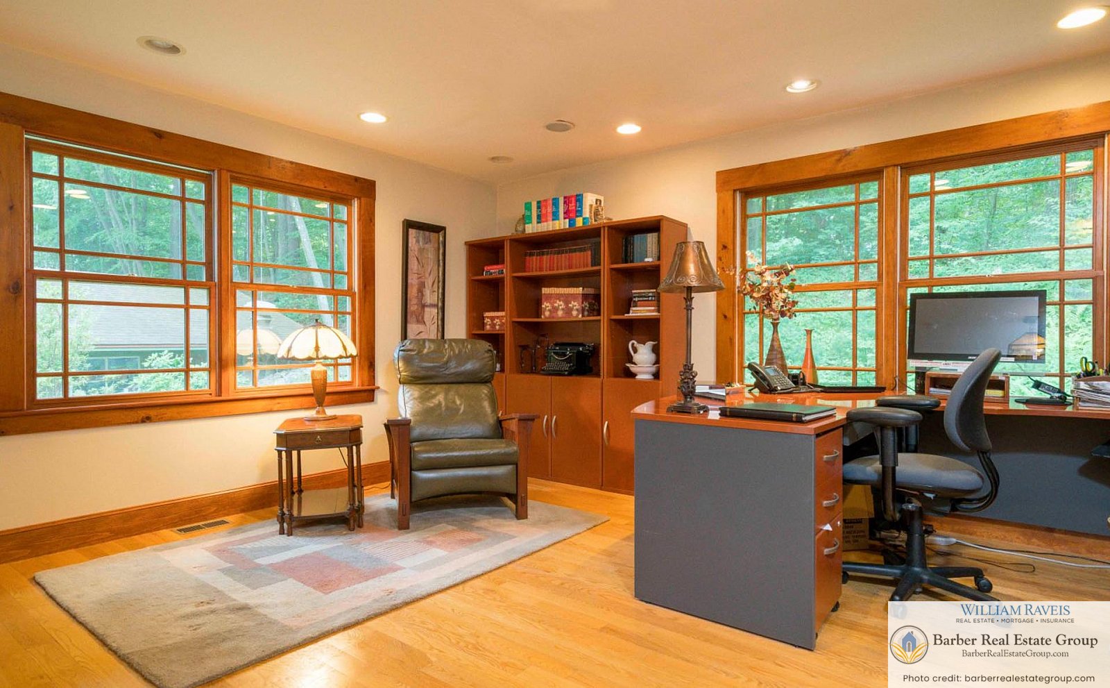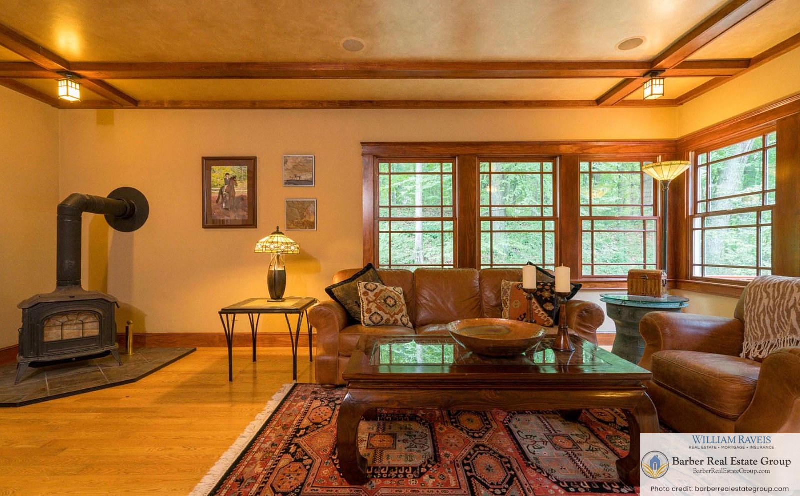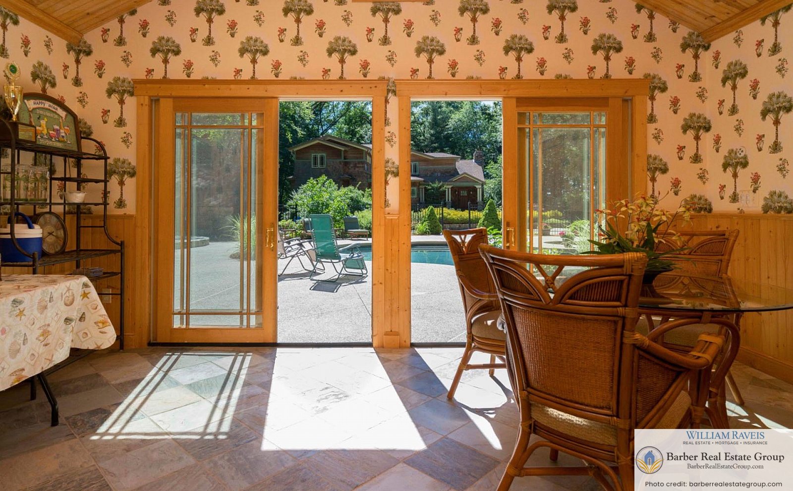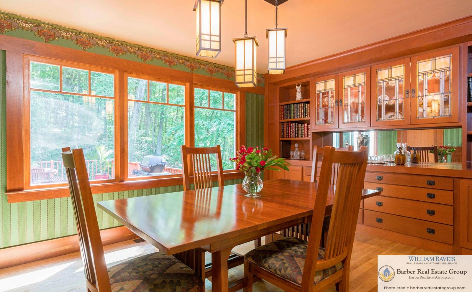 This homage is most evident in the living room, where a stately river stone fireplace and Craftsman-style wood wainscoting take center stage. The same meticulous attention to detail continues throughout the home, especially in the kitchen and dining room, where rich woodworking and period-inspired wallpaper add warmth and authenticity.