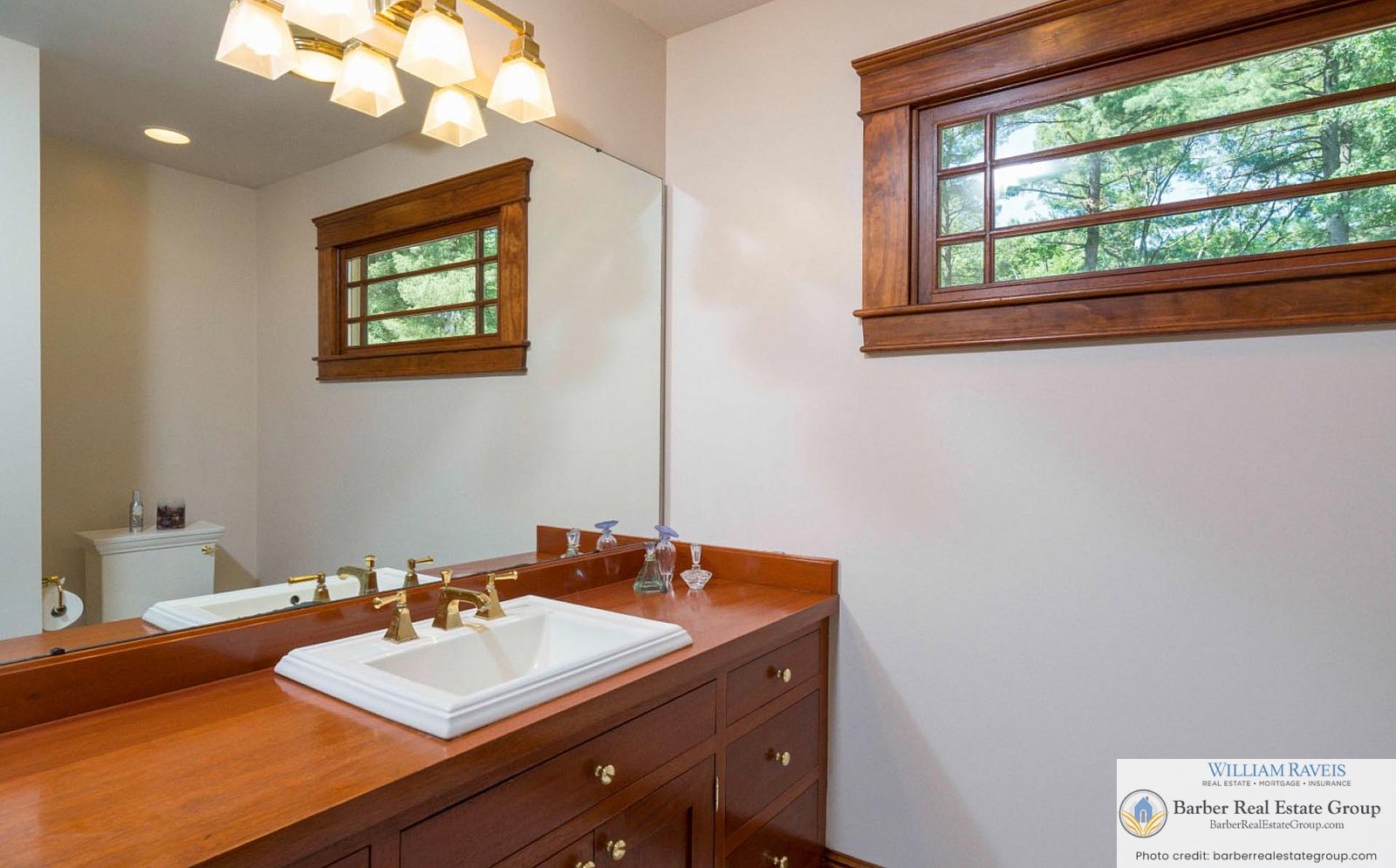 This homage is most evident in the living room, where a stately river stone fireplace and Craftsman-style wood wainscoting take center stage. The same meticulous attention to detail continues throughout the home, especially in the kitchen and dining room, where rich woodworking and period-inspired wallpaper add warmth and authenticity.